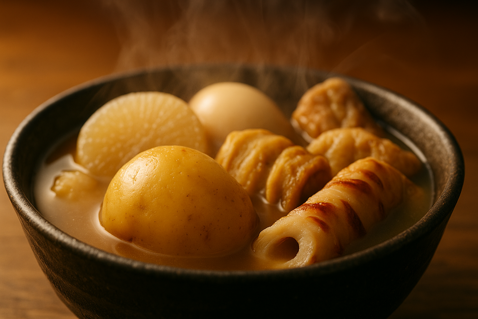 おでんを強火でグツグツ煮てしまうと、じゃがいものデンプンが急に壊れてしまい、ふにゃっと崩れやすくなってしまいます。せっかく形よく仕上げたいなら、火加減は弱火〜中弱火をキープして、鍋の中で具材がゆっくり踊るような“コトコト煮”を心がけるのがいちばん。弱火でじっくり火を通すことで、じゃがいもがふっくらとしながらも型崩れしにくくなり、出汁の味も自然としみ込んでいきます。「焦らずゆっくりね〜」と声をかけてあげるような気持ちで火を入れると、びっくりするほど仕上がりが変わりますよ。