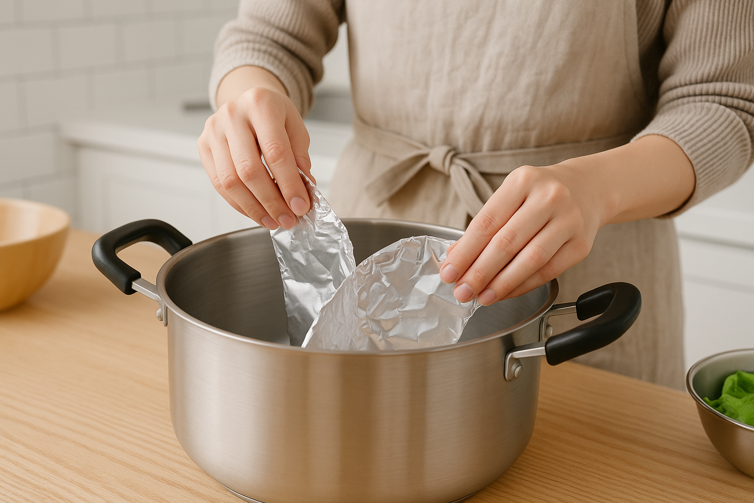 さらに、アルミホイルの折り方にもひと工夫を。ふちを少し広げて鍋の側面に当てるようにすると、より安定感が増しますよ。