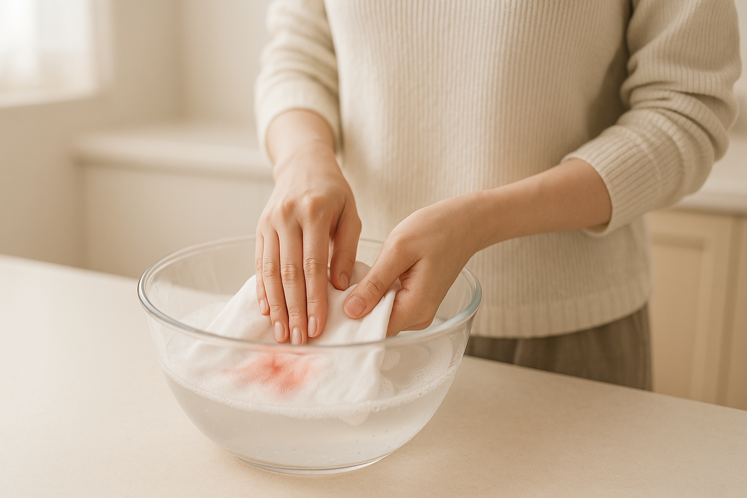 すぐにぬるま湯で軽く押し洗いするだけでも、後の落ちやすさが本当に大きく変わってきます。ここでのポイントは、とにかく“早く・やさしく”が鉄則です。まずは慌てず、汚れが広がらないようにそっと押し洗いしてあげてください。強くこすると繊維の奥に色素が押し込まれてしまうので逆効果なんですね。ほんの数十秒のケアでも、あとから本格的に落とすときの負担をグッと軽くしてくれるので、気づいた瞬間にサッと動くことが、きれいに仕上げるための大事な第一歩になりますよ。